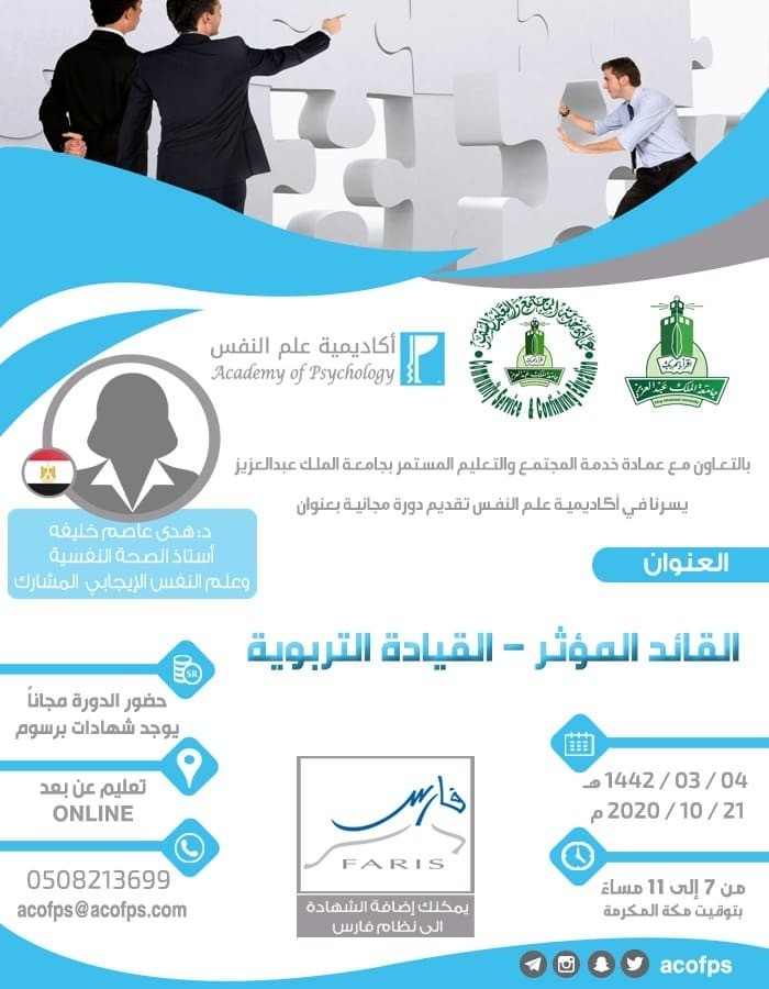 يسرنا في اكاديمية علم النفس وبالتعاون مع عمادة خدمة المجتمع والتعليم المستمر بجامعة الملك عبد العزيز الاعلان عن ( 20 دورة ) مجاناً للاطلاع على جدول الدورات والتسجيل : https://acofps.com/storage/app/media/social/dor-mjana.pdf — للاستفسارات : اتصال : 00966508213699 واتساب : https://goo.gl/9BWbQZ تحياتنا اكاديمية علم النفس https://i.suar.me/o1Eyx/l https://i.suar.me/VpEG9/l https://i.suar.me/JMvX5/l https://i.suar.me/AdPZL/l https://i.suar.me/B3vZv/l |