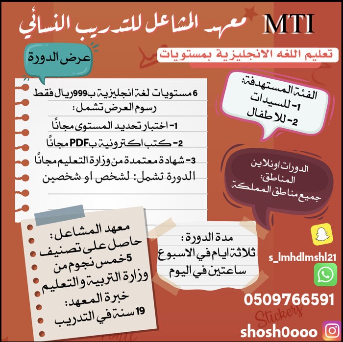 السلام عليكم ورحمة الله وبركاته معاكم معهد المشاعل للتدريب النسائي عندنا عرض جميل ومناسب جدا للسيدات والاطفال العرض لتعليم اللغة الانجليزية بمستويات/6 مستويات لغه إنجليزية 999 ريال فقط رسوم العرض يشمل / اختبار تحديد المستوى + الكتب المنهج بPDF + الشهادة المعتمدة العرض يشمل/ السيدات و الاطفال الدورات /عن بعد اونلاين المناطق / جميع المناطق المملكة معهد المشاعل حاصل على تصنيف 5 خمس نجوم من وزارة التربية والتعليم خبرة المعهد المشاعل/ 19 سنه في التدريب الايام/ 3 ايام في الاسبوع ( السبت - الاثنين - الاربعاء) او ( الاحد- الثلاثاء- الخميس) الاوقات/ ساعتين في اليوم ( صباحا/ من 10 الى 12 ظهرا ) او ( ظهرا / من 12 الى 2 ظهرا ) او ( عصرا / من 5 الى 7 مساء ) او ( مساء / من 7 الى 9 مساء) يمكنك تقاسم الدورات ل اختك ابنتك/ ابنك صديقتك مكان المعهد : جدة / حي الصفا سارع في التسجيل قبل اكمال المقاعد لحجز مكانك في العرض قبل ما ينتهي التواصل عبر الواتساب : 0509766591 كل شي موجود للسيدات والاطفال لجميع مناطق المملكه https://i.suar.me/LG6vE/l |